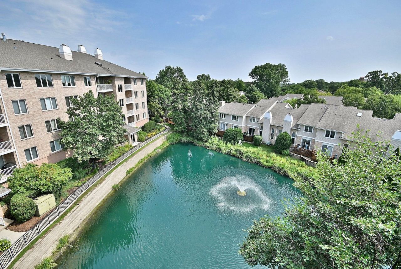 Welcome to this exquisite three-bedroom, two-bath corner unit condo, ideally situated on the top floor to provide maximum privacy and abundant natural light. This unit faces east and north, so the exposure to the highway is limited. The primary bedroom and that balcony overlooks a pond and looks east. Enjoy picturesque, unobstructed views of a serene, swan-filled pond from multiple vantage points throughout the home. The open floor plan features soaring ceilings and a spacious living area that flows seamlessly into the dining and kitchen space-perfect for everyday living or entertaining. Inside, you'll find elegant porcelain flooring, freshly painted walls, updated kitchen appliances, and the convenience of in-unit laundry. The kitchen offers generous cabinet and counter space, making meal prep a breeze. The luxurious primary suite includes its own private balcony, perfect for relaxing and taking in the scenic surroundings. Two additional, generously sized bedrooms offer flexible options for guests, a home office, or additional living space. With two private balconies, you'll enjoy plenty of outdoor space to unwind. The well-maintained community features walking paths, a tranquil pond with a charming gazebo, beautifully landscaped grounds, and the convenience of a heated garage with additional storage. Combining comfort, style, and natural beauty, this rare top-floor unit is a true gem. Don't miss your opportunity to make it your new home!